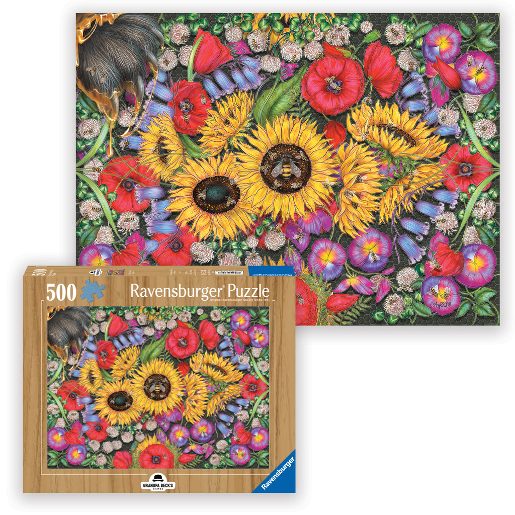 Enjoy a beautifully illustrated 500-piece jigsaw puzzle featuring artwork from The Bears and the Bees.